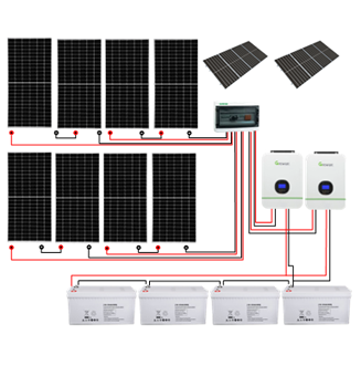 Kit fotovoltaico diseñado para respaldar instalaciones de hasta 4 KW de demanda con inversores en paralelo para lograr fase dividida a 110/220 V de tensión. Concebido para cargar las baterías usando la energía solar fotovoltaica y/o la red eléctrica. Este kit permite la conexión de equipos a 220V como aires acondicionados y splits. Posee capacidad de crecimiento posterior en potencia demandada.